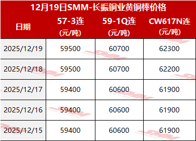 【SMM价格】2025年12月19日长振黄铜棒价格