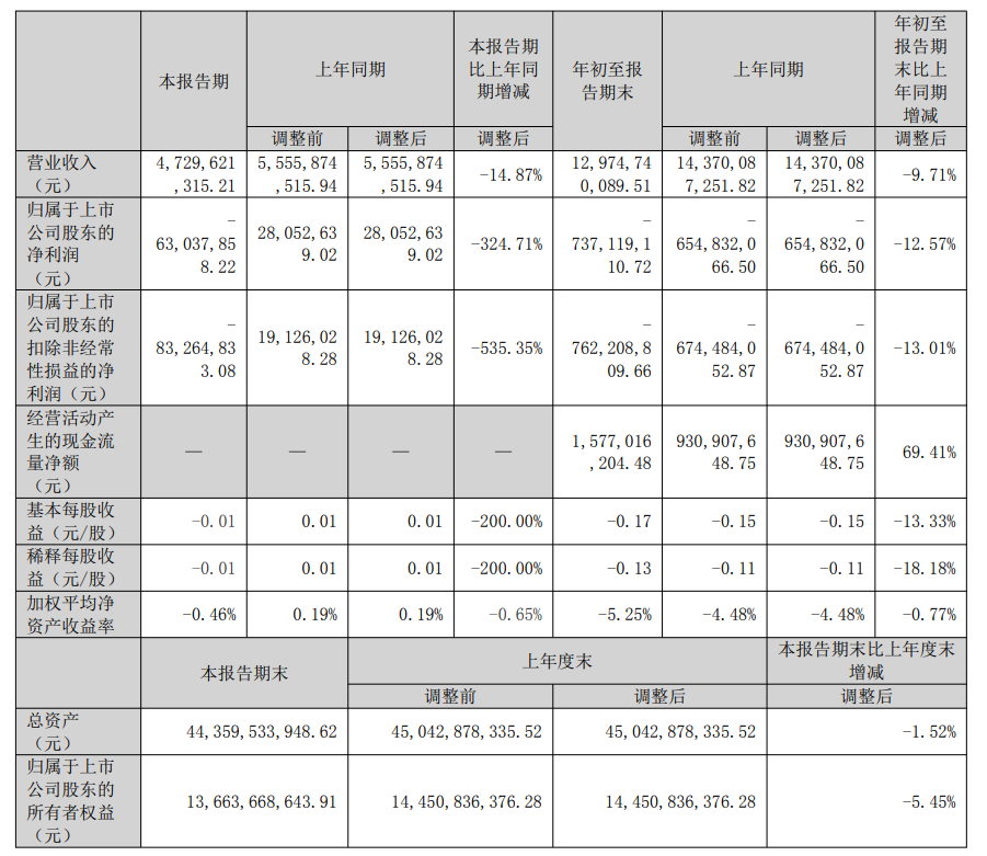 美锦能源10月30日发布2025年三季报显示,公司前三季实现营业收入129.75亿元,同比下滑9.71%;归母净利润-7.37亿元;扣非归母净利润-7.62亿元。
