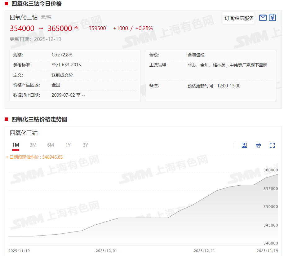 据SMM现货报价显示,本周四氧化三钴现货报价涨势可观,截至12月19日,四氧化三钴现货报价涨至35.4~36.5万元/吨,均价报35.95万元/吨,较12月12日上涨4500元/吨,涨幅达1.27%。