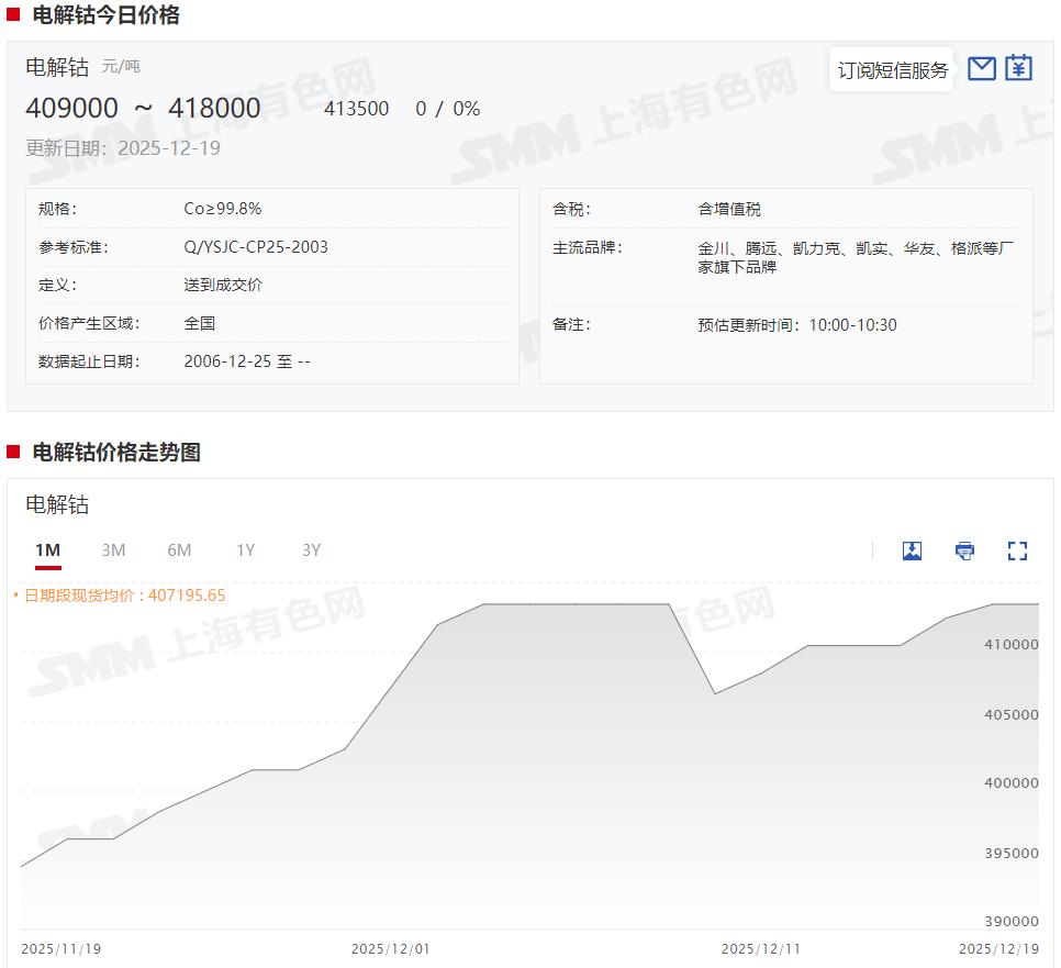 据SMM现货报价显示,本周电解钴现货报价整体呈现上涨态势,截至12月19日,电解钴现货报价涨至40.9~41.8万元/吨,均价报41.35万元/吨,较12月12日的41.05万元/吨上涨3000元/吨,涨幅达0.73%。