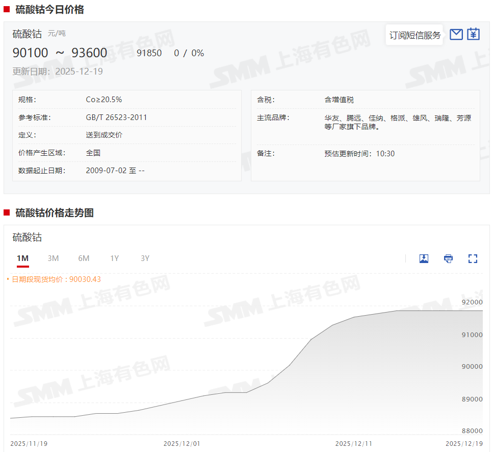 据SMM现货报价显示,本周硫酸钴现货报价在周初上涨100元/吨之后维持稳定,截至12月19日,硫酸钴现货报价涨至90100~93600元/吨,均价报91850元/吨,较12月12日涨幅达0.11%。