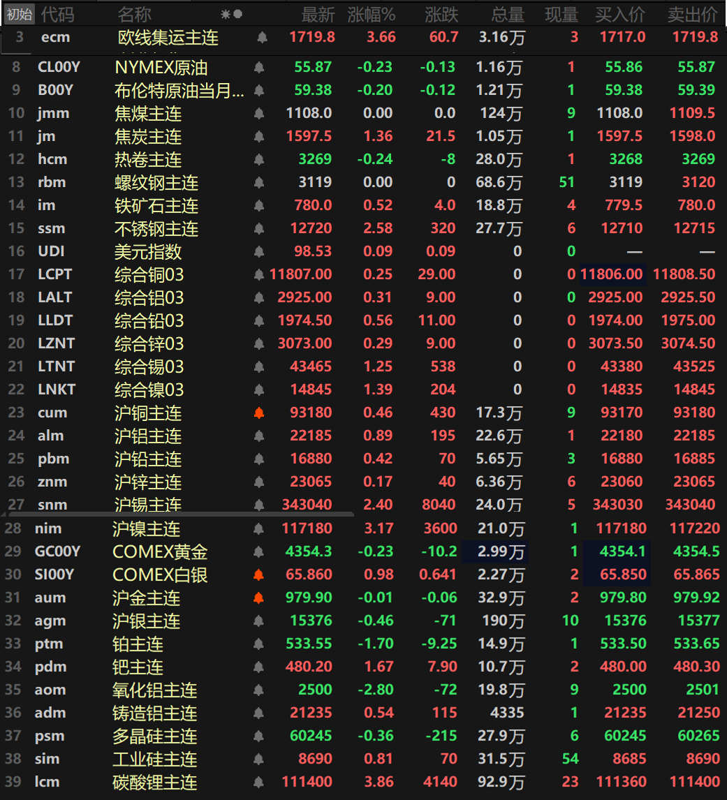 此外,碳酸锂主连涨3.86%,工业硅主连涨0.81%,多晶硅主连跌0.36%。欧线集运主连涨3.66%报1719.8。