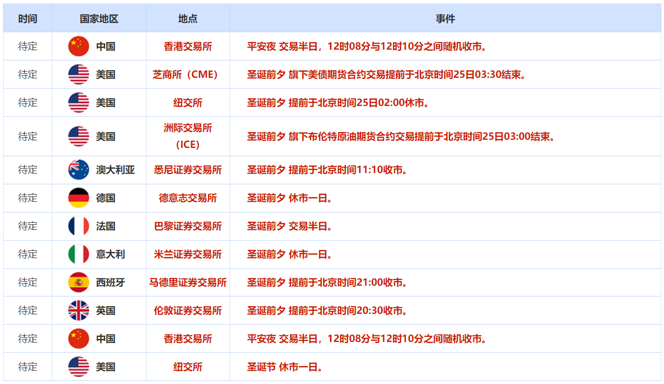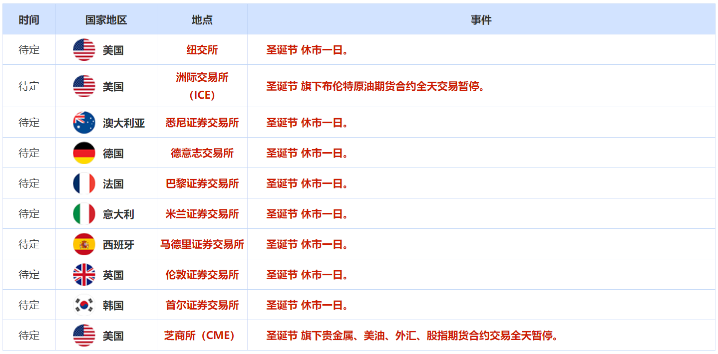 12月25日恰逢圣诞节,美国纽交所、澳大利亚悉尼证券交易所、德国德意志交易所、法国巴黎证券交易所、意大利米兰证券交易所、西班牙马德里证券交易所 、英国伦敦证券交易所、韩国 首尔证券交易所等交易所均因圣诞节 休市一日。美国洲际交易所(ICE)因圣诞节 旗下布伦特原油期货合约全天交易暂停,美国芝商所(CME) 圣诞节 旗下贵金属、美油、外汇、股指期货合约交易全天暂停。