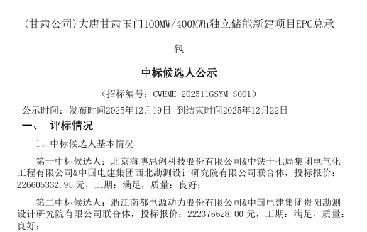 北极星储能网获悉,12月19日,大唐甘肃玉门100MW/400MWh独立储能新建项目EPC中标候选人公示,第一中标候选人:北京海博思创科技股份有限公司&中铁十七局集团电气化工程有限公司&中国电建集团西北勘测设计研究院有限公司联合体,投标报价:226605332.95元,中标单价约合0.5665元/Wh;