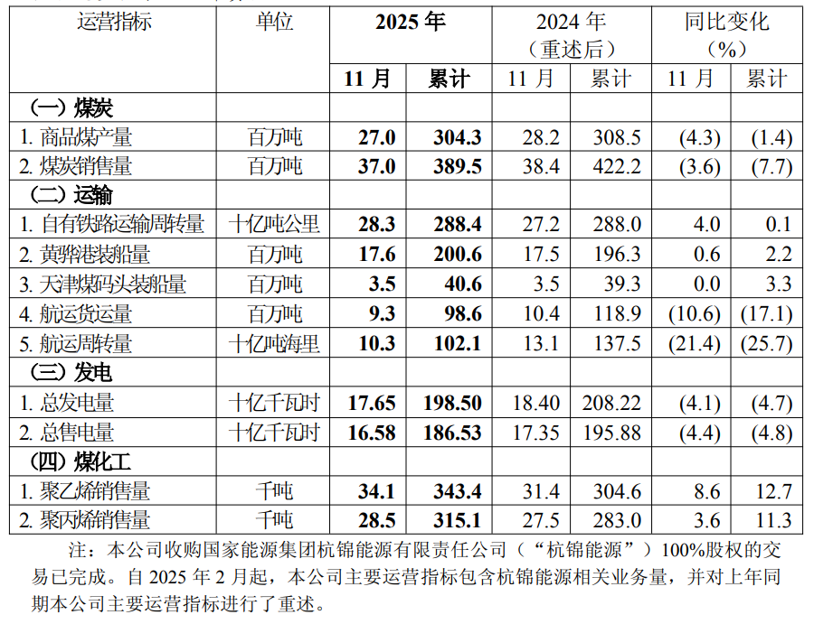 中国神华在公告中表示:2025 年 11 月,本公司航运货运量及周转量同比下降的主要原因,是业务结构调整、航线结构变化。 2025 年 1-11 月,本公司聚乙烯、聚丙烯销售量同比增长的主要原因,是上年同期煤制烯烃生产设备按计划检修导致基数较低。