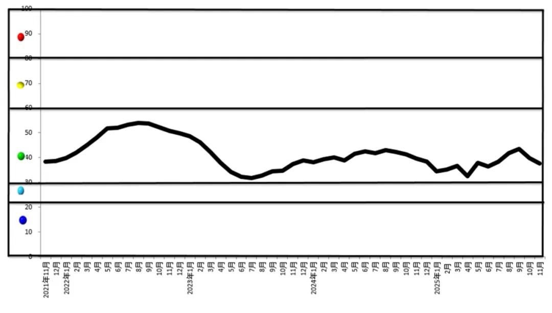 11月份,中国铅锌产业月度景气指数为37.7,较10月下降2.1个点,继续在“正常”区间运行。行业整体保持平稳运行,但部分分项指标出现回落,反映当前市场供需格局仍面临一定调整压力。中国铅锌产业月度景气指数运行趋势如图1所示。
