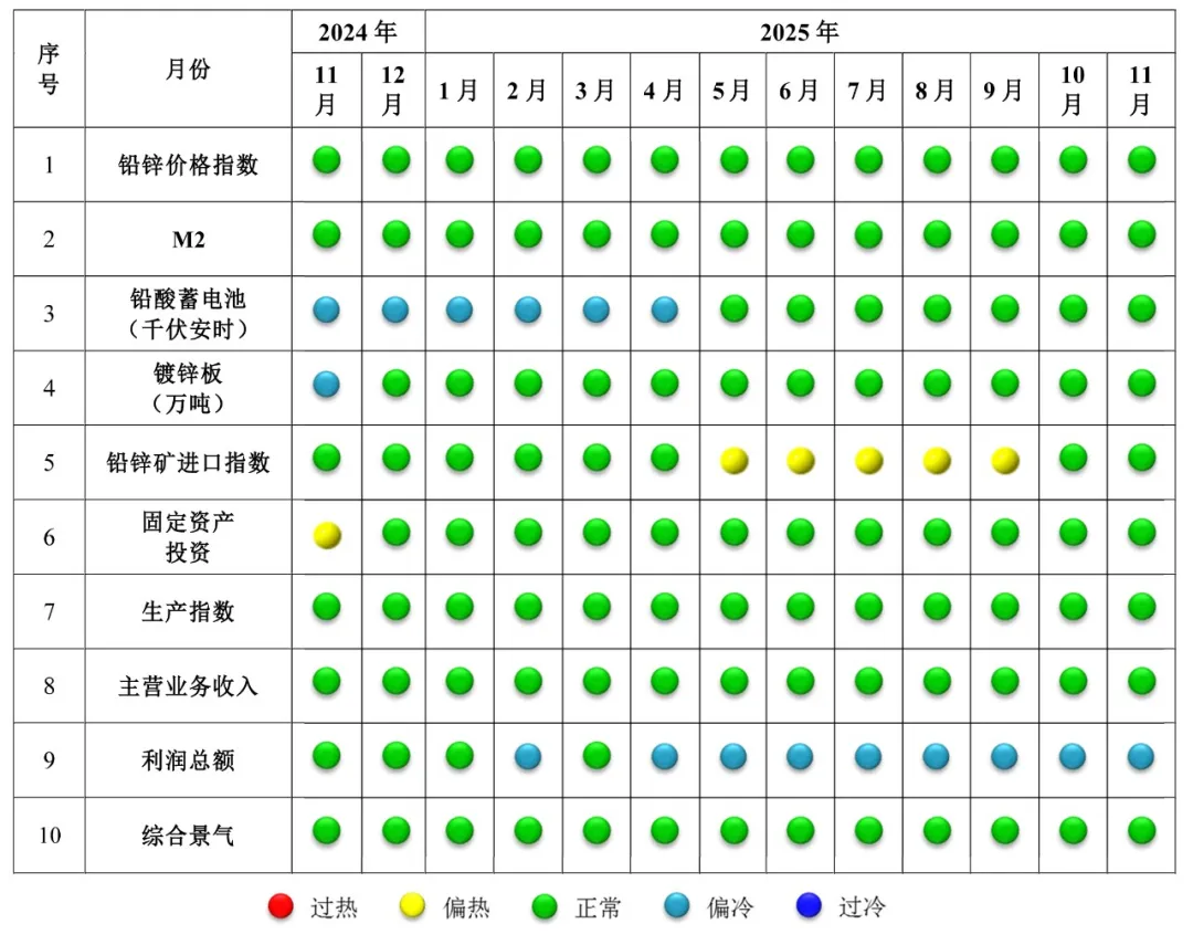 11月份,中国铅锌产业景气指数虽小幅回落,但仍在“正常”区间内运行。当前行业呈现“生产平稳、投资收缩、盈利承压”的结构特征。展望未来,在宏观经济政策持续支持、产业结构逐步优化、绿色转型深入推进的背景下,铅锌产业有望继续保持总体稳定运行,但仍需关注外部贸易环境变化与内部成本压力对企业经营的持续影响。