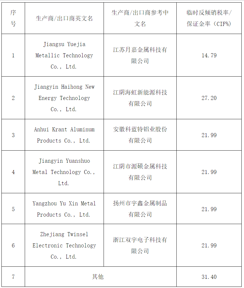 附表:土耳其对华光伏铝边框反倾销初裁征税表