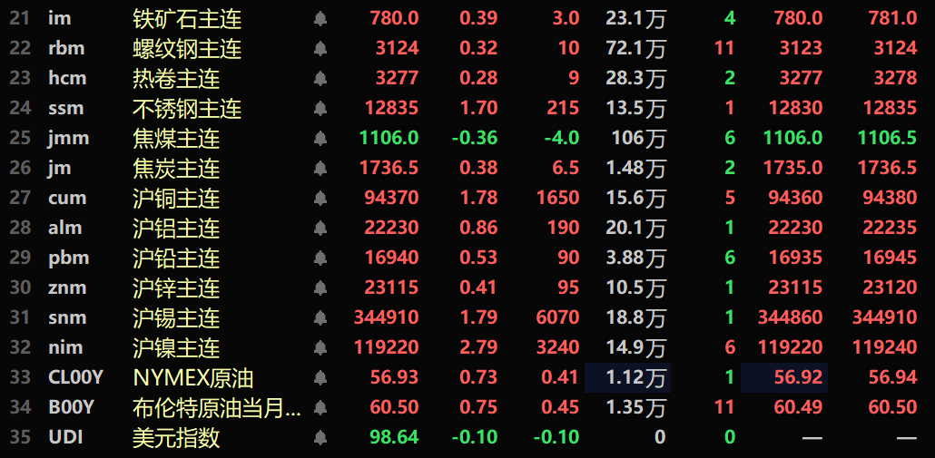 黑色系多飘红,铁矿涨0.39%,螺纹涨0.32%,热卷涨0.28%,不锈钢涨1.7%。双焦方面:焦煤主力合约跌0.36%,焦炭主力合约涨0.38%。