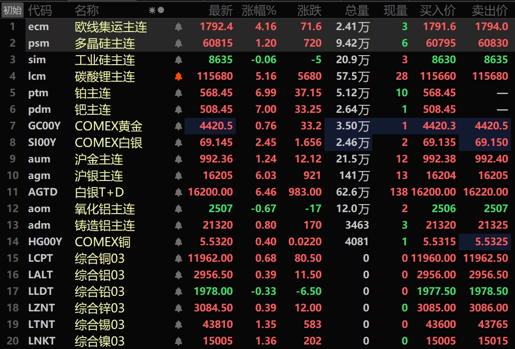 贵金属方面,截至11:39分,COMEX黄金涨0.76%,盘中刷新历史新高至4424.2美元/盎司;COMEX白银涨2.45%,盘中刷新历史新高至69.36美元/盎司。内盘贵金属方面:沪金主连涨1.24%,沪银主连涨6.03%,盘中刷新历史新高至16237元/千克。