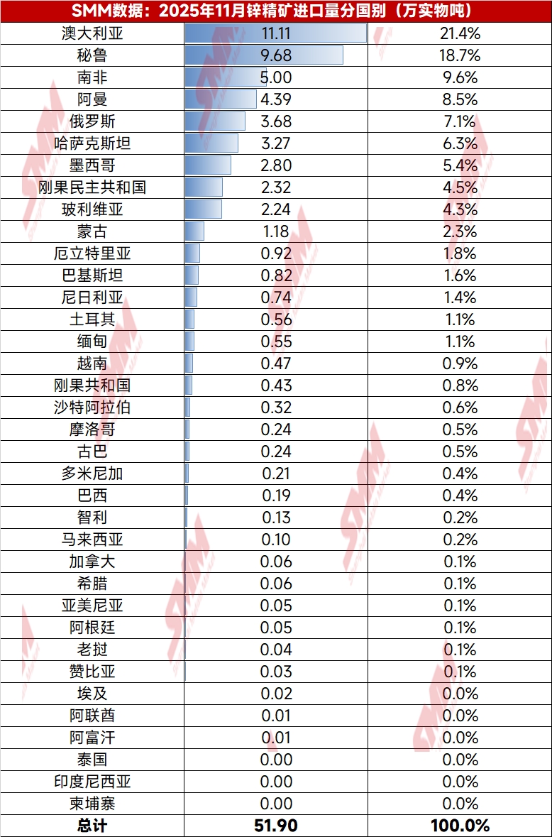 - 受周期性到货影响,澳大利亚锌精矿于11月到货量环比增多,贡献11月主要增量;