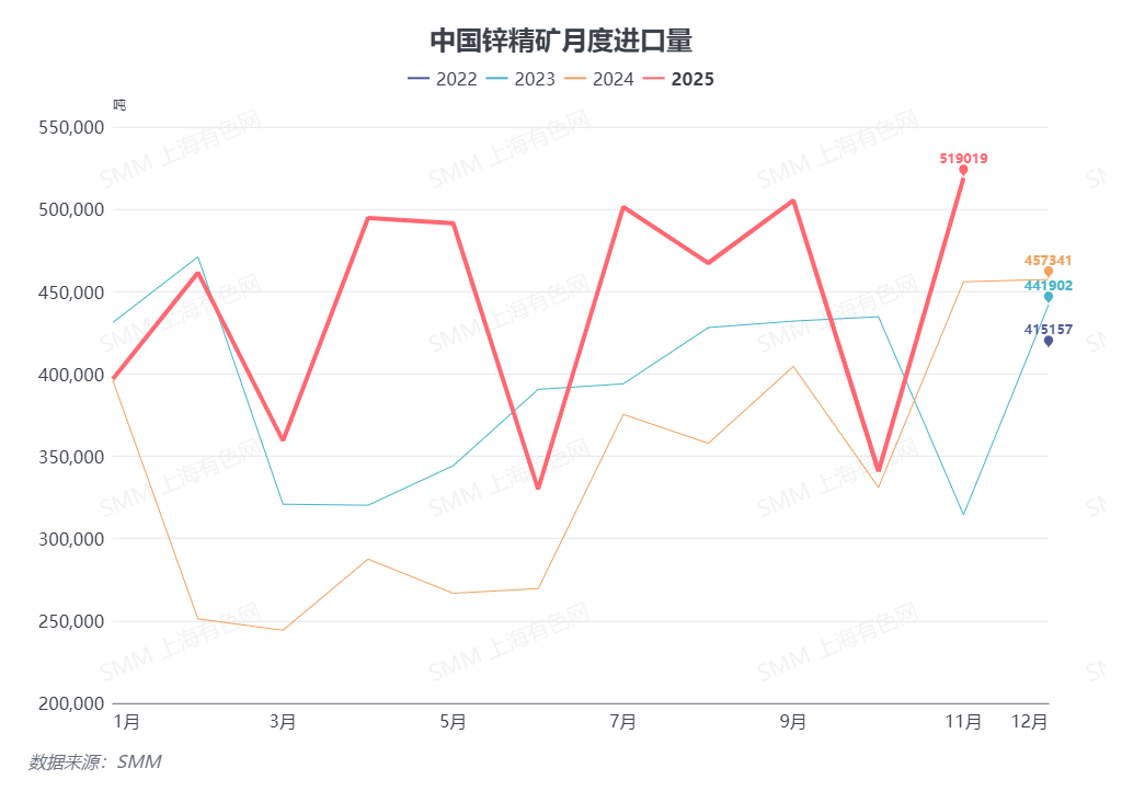 SMM认为11月进口锌精矿量较10月增长明显,基本符合市场前期预期,原因如下: