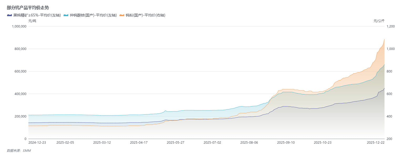 进入2025年12月下半月,国内钨行业迎来今年全年最后一轮长单报价窗口期,伴随多家企业报价陆续公布,钨企全年长单报价最终以上涨的态势收官!部分上游企业计划性的年末检修导致供应收缩、政策管控趋严、以及矿端剩余可用指标较少等均为钨价的持续上行提供了重要支撑。截至12月22日,黑钨精矿今年以来的涨幅为214.89%。,仲钨酸铵的涨幅为213.54%,钨粉的涨幅为244.99%。受钨价大幅攀升影响,市场成交结构发生显著变化,终端采购以刚需为主,整体成交规模较前期明显缩量。与此同时,以刀具为代表的钨加工终端企业,因原材料成本持续承压,年内已多次启动产品调价,以此缓解成本上涨带来的经营压力。