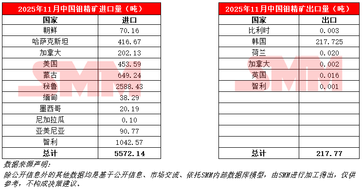 2025年11月中国钼精矿进口5572.14吨,环比增加4.19%;出口217.77吨,环比增加86.55%。