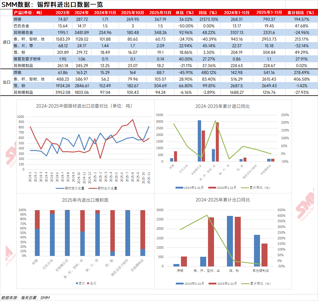 2025年11月锡焊料进出口数据一览【SMM数据】