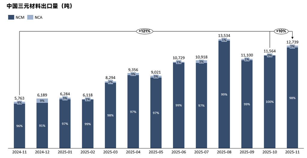 2025年11月,中国三元材料(NCM+NCA合计数值)出口量为12739吨,环比增加10%,同比增加121%。其中,NCM累计出口12503吨,环比增加9%,同比增长125%。NCA累计出口236吨,环比增加329%,同比增长12%。