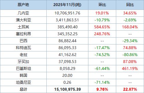 以下为根据中国海关总署官网数据整理的2025年11月铝土矿进口分项数据一览表: