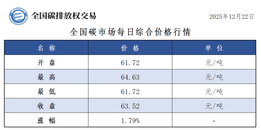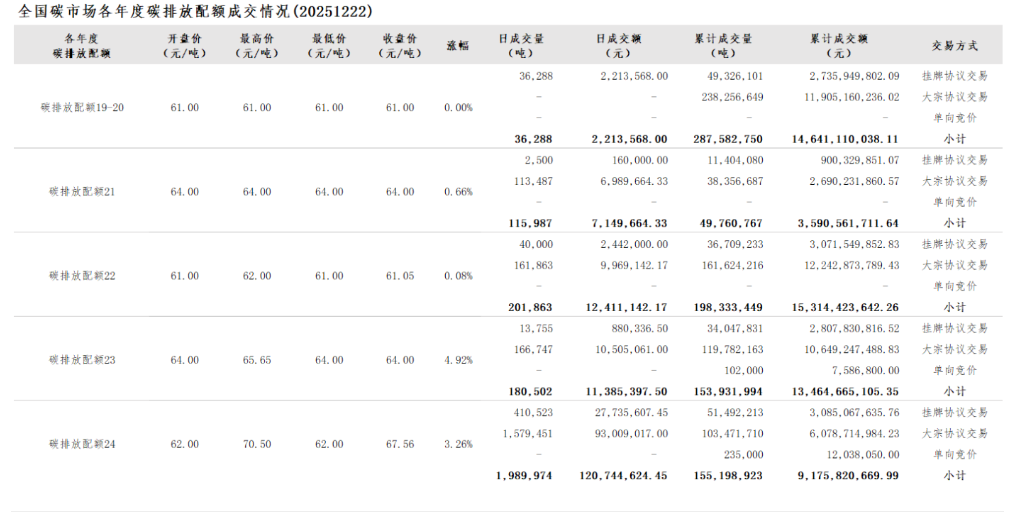 2025年1月1日至12月22日,全国碳市场碳排放配额成交量214,539,219吨,成交额13,153,854,063.84元。