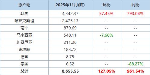 以下为根据中国海关总署官网数据整理的2025年11月精炼铅进口分项数据一览表: