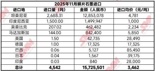 2025年11月,中国鳞片石墨进口量为4542吨,环比出现26%的增长,同比增幅高达44%。