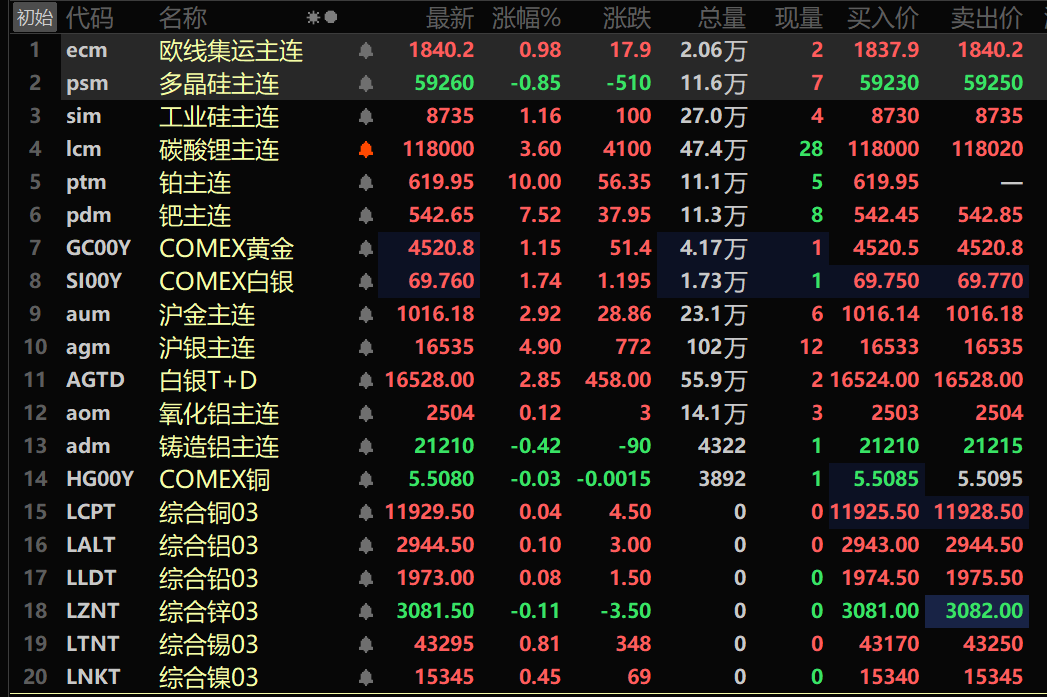 此外,铸造铝主连期货跌0.42%,氧化铝主连涨0.12%。碳酸锂主连涨3.6%。工业硅主连涨1.16%。多晶硅主连跌0.85%。