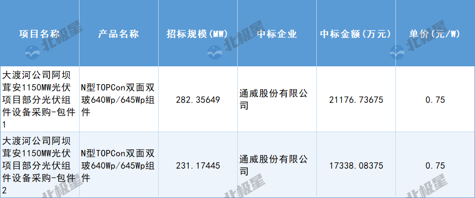 12月23日,大渡河公司阿坝茸安1150MW光伏项目部分光伏组件设备采购公开招标中标结果公布,项目分为2个标包,中标企业均为通威股份有限公司,单价均为0.75元/W。
