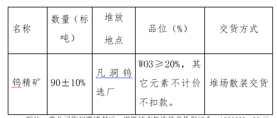 二、竞价后我公司只对含钨和水份进行检测,其他元素指标不作检测。同时,中标单位需在提货前足额支付钨精矿货款。