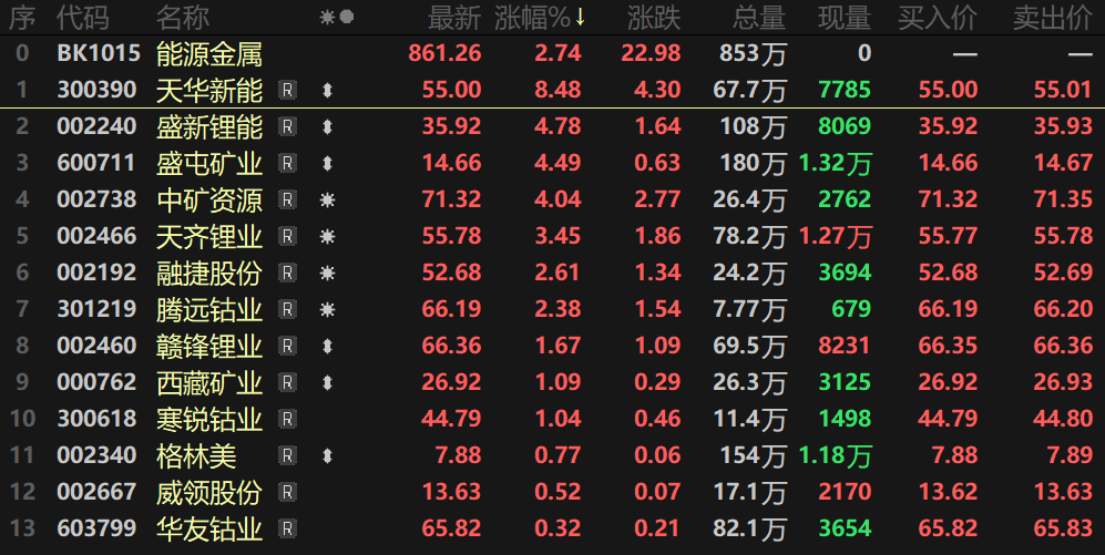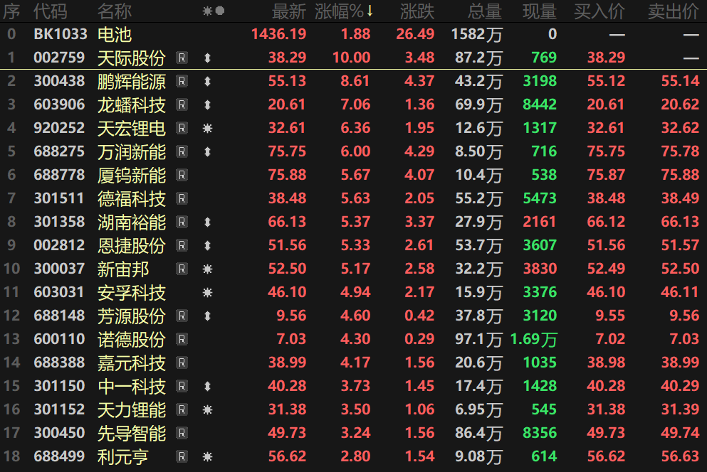 SMM 12月23日讯:12月23日,能源金属、电池板块一同走高,能源金属板块指数以2.74%的涨幅在所有行业板块中排名前列,电池板块紧随其后,涨幅高达1.88%。能源金属板块个股方面,天华新能涨逾8%,盛新锂能、盛屯矿业、中矿资源等多股涨逾4%。电池个股方面,天际股份以10%的涨幅封死涨停板,鹏辉能源、龙蟠科技、天宏锂电、万润新能等多股涨逾6%。