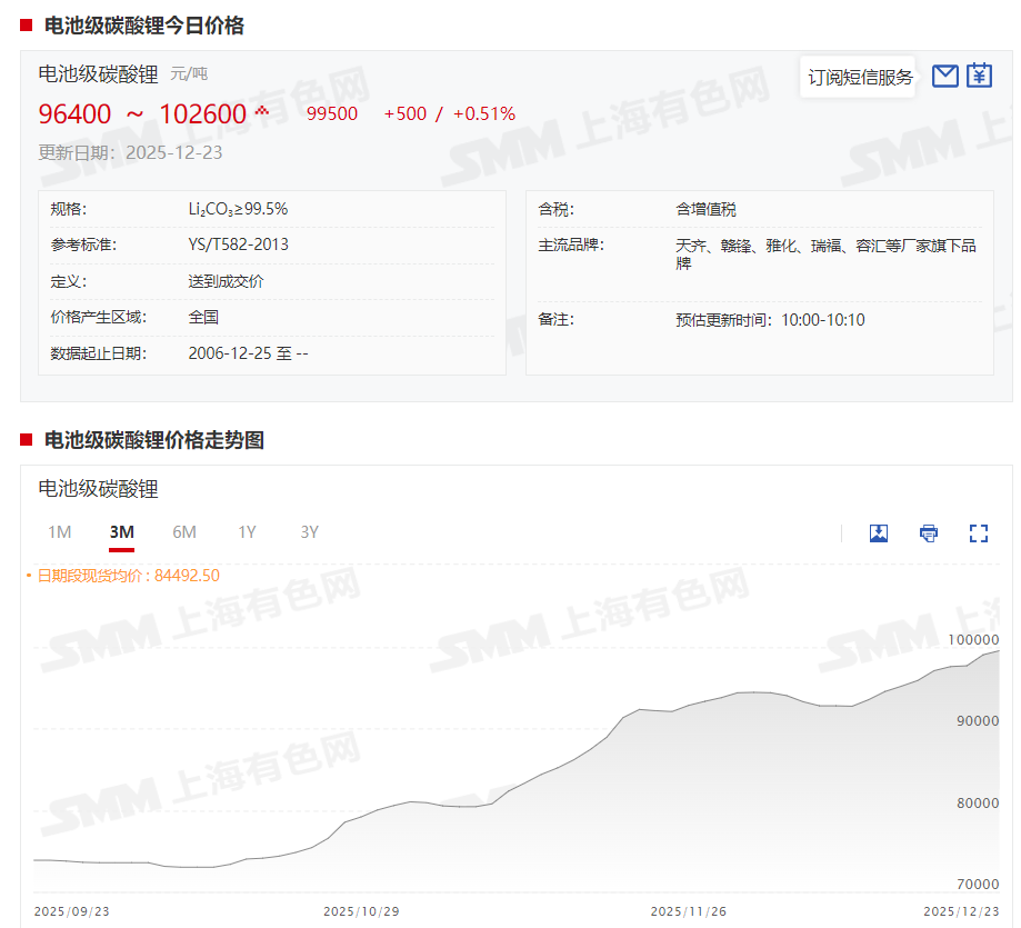 现货价格方面,据SMM现货报价显示,电池级碳酸锂现货报价近几个交易日也接连上探,截至12月23日,其现货报价涨至96400~102600元/吨,均价报99500元/吨。