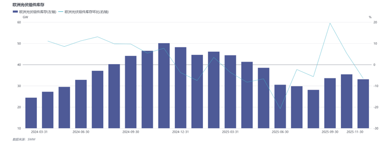 2025年下半年:震荡与按需采购。 2025年第三季度起,库存走势出现波动。9月份库存环比增速一度反弹至近20%,库存量回升至35GW左右,随后在11月再次回落。这种波动表明市场已结束了单纯的去库存模式,转为根据项目进度进行动态调整。当前的库存水平(约33GW)显著低于2024年峰值,显示供需关系已趋于理性,但月度间的波动也反映出供应链对政策与需求的反应更为敏感。