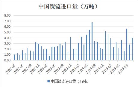 据海关总署数据显示,2025年11月中国镍锍进口量4万吨,环比增加1.16万吨,增幅41.03%;同比增加1.53万吨,增幅68.36%。其中自印度尼西亚进口量为3.78万吨,环比增加35.41%,占本月进口量的94.52%。2025年1-11月镍锍进口总量39.29万吨,同比减少0.66%。