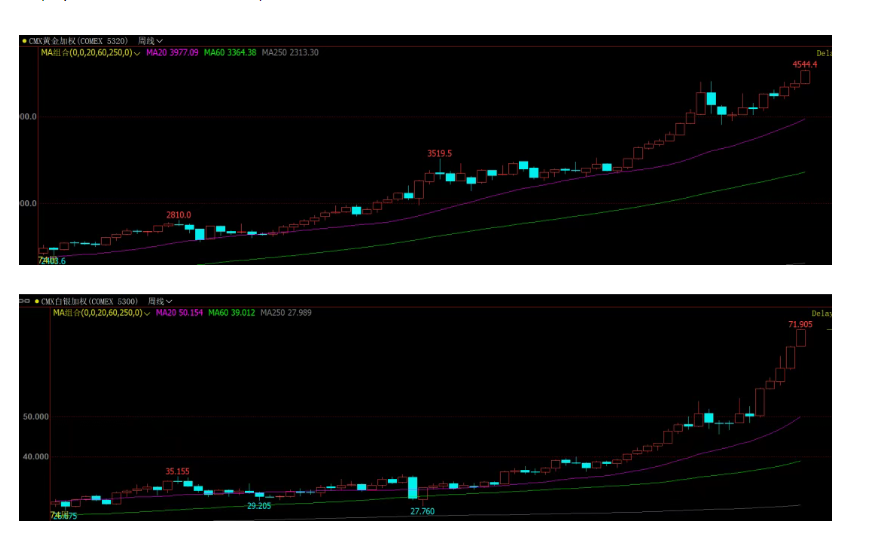 近期,国际贵金属市场迎来一轮凌厉涨势,黄金、白银价格持续攀升并刷新历史纪录。与此同时,具备较强金融属性的铜等有色金属也同步走强。期货日报记者了解到,贵金属这一波行情的核心驱动力是宽松的货币环境带来的流动性。