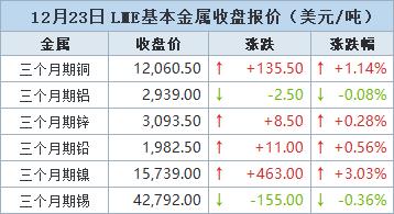 伦敦时间12月23日17:00(北京时间12月24日01:00),LME三个月期铜上涨135.5美元,或1.14%,收报每吨12,060.5美元,盘中创历史新高12,159.50美元。