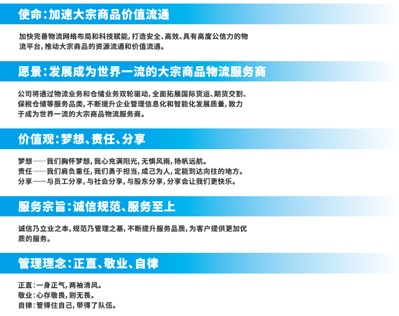 秉承诚信、安全、效益、规范的服务理念、专注于大宗商品物流领域、公司在广东佛山、新疆石河子、昌吉,江苏无锡,广西钦州、靖西,河南巩义,江西南昌等国内大宗商品主要产地及物流集散地规划布局的供应链物流网络已初具规模,同时,公司积极拓展海外物流市场,在新加坡,马来西亚,几内亚等国设立分支机构,逐渐形成与产业链深度融合、物流、仓储横向联动发展、纵向深耕多式联运的业务格局。