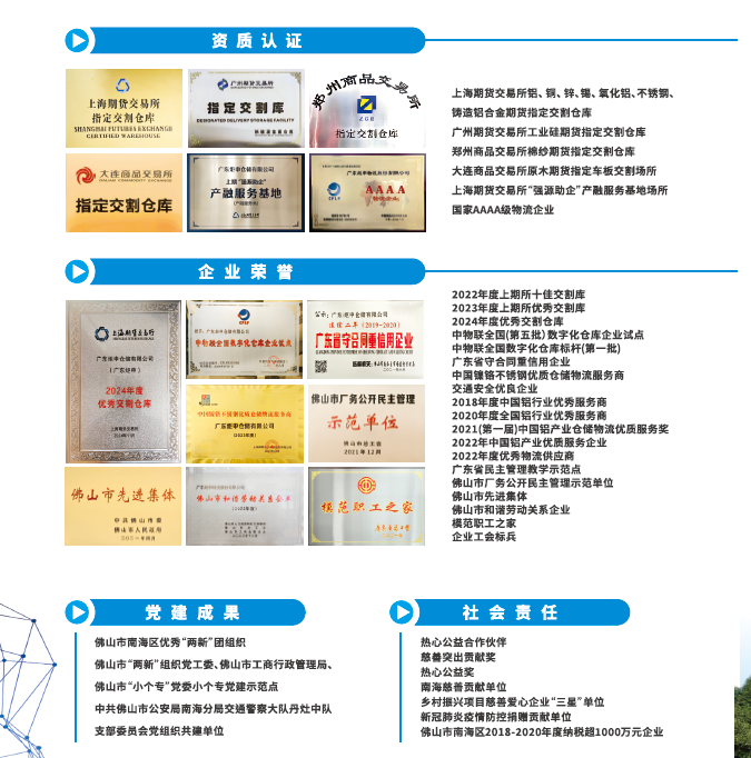 成立于2011年12月,位于广东省佛山市南海区丹灶镇,主营大宗商品的存储保管、装卸、理货及按货主指令进行出入库管理、货权转移、期货仓单制作等综合仓储业务。