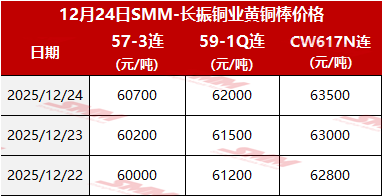 【SMM价格】2025年12月24日长振黄铜棒价格