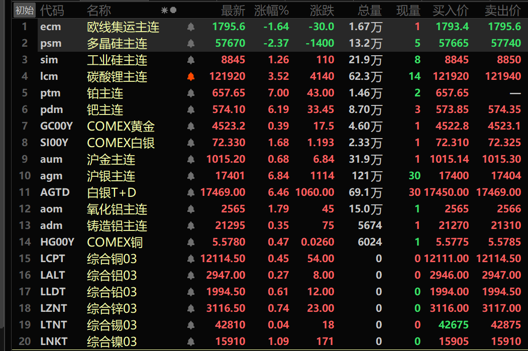 贵金属方面,截至11:46分,COMEX黄金涨0.39%,盘中刷新历史新高至4555.1美元/盎司;COMEX白银涨1.68%,盘中刷新历史新高至72.75美元/盎司。内盘贵金属方面:沪金主连涨0.68%,盘中刷新历史新高至1022.88元/克;沪银主连涨6.84%,盘中刷新历史新高至17487元/千克。