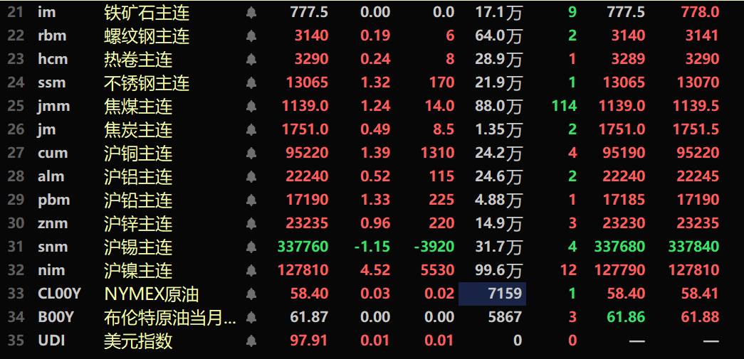 截至午间收盘,内盘基本金属普涨,沪铜涨1.39%。沪铝涨0.52%。沪铅涨1.33%,沪锌涨0.96%。沪锡跌1.15%,沪镍涨4.52%。