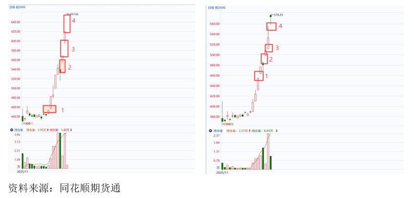 此外,通常稳健的上涨行情往往伴随着持仓与成交量的温和放大。本轮上涨主要由资金推动,前几日虽一度出现缩量,但近日有所修复。后续需密切关注持仓与成交变化,尤其是若出现减仓迹象,这或许是盘面节奏变化的关键观察点。(自12月12日上涨开启以来,铂钯主力合约每日都在增仓,暂未出现减仓)