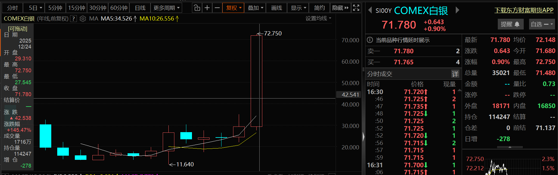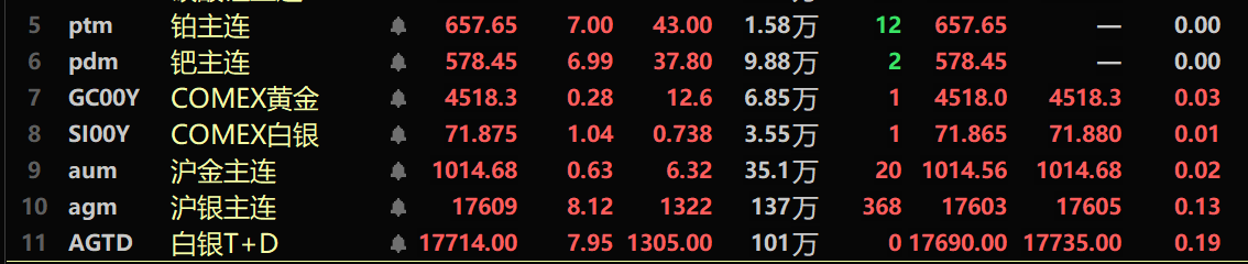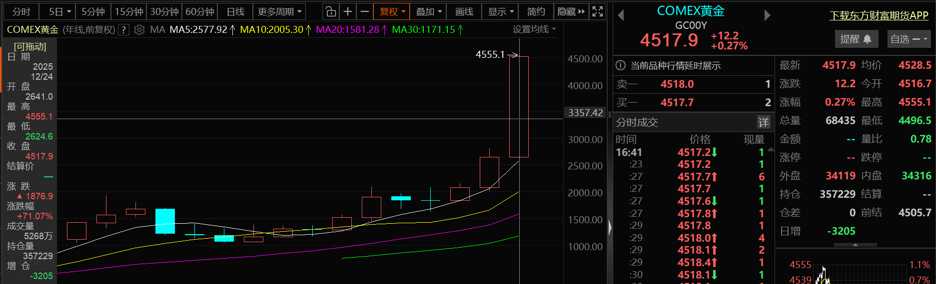 近期金银铂钯等贵金属期货呈现持续强势上涨态势,核心系多重利好因素共振推动,其中美联储宽松预期升温与美元走弱构成重要驱动力,美国与委内瑞拉等地缘紧张局势升级进一步抬升避险需求,叠加圣诞旺季与国内年末婚庆、送礼刚需释放带来的实物消费提振和深圳水贝等核心市场白银投资需求攀升,以及交易所交易基金(ETF)投资需求的增长等支撑,共同推动金银铂钯等贵金属品类频频刷新价格纪录。截至12月24日16:51分左右,COMEX黄金涨0.27%,盘中刷新历史新高至4555.1美元/盎司,其今年以来的年线涨幅暂时为71.07%;沪金主连涨0.63%,盘中刷新历史新高至1022.88元/克,其今年以来的年线涨幅暂时为64.54%;COMEX白银涨1.09%,盘中刷新历史新高至72.75美元/盎司,其今年以来的年线涨幅暂时为145.91%;沪银主连涨8.12%,盘中刷新历史新高至17761元/千克,其今年以来的年线涨幅暂时为134.82%;白银T+D涨7.95%,盘中刷新历史新高至17755元/千克,其今年以来的年线涨幅暂时为136.94%。此外,铂主连以7%的涨停幅度报收,其刷新上市以来的新高至657.65元/克,其今年以来的年线涨幅暂时为62.38%;钯主连以6.99%的涨停幅度报收,其刷新上市以来的新高至578.45元/克,其今年以来的年线涨幅暂时为58.48%。