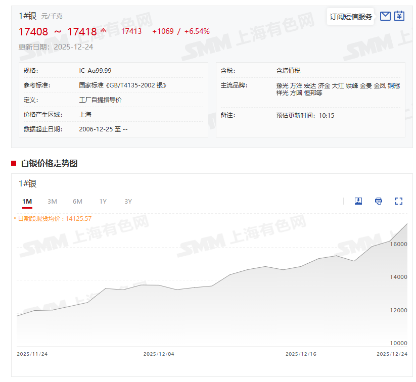 随着白银期货再次频繁刷新历史新高,白银现货价格也出现了大幅上涨!12月24日,SMM1#白银上午出厂参考均价为17413元/千克,均价较前一交易日涨1069元/千克,涨幅为6.54%。据了解,日内TD-沪银主力2602合约基差收窄偶有倒挂。上海地区国标银锭持货商主流报价对TD升水0-5元/千克或对沪期银2602合约平水附近报价,深圳地区升水大幅抬升至TD升水10-20元/千克。临近年底,下游普遍关账盘点,采购需求大幅下滑,市场成交以投资需求为主,市场实际成交尚可。