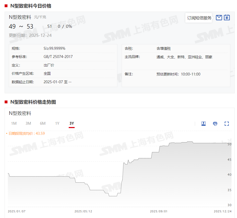 而据SMM现货报价显示,自7月份国内“反内卷”政策持续加码以来,光伏行业作为内卷的“重灾区”,国家、行业协会及企业协同推进,行业自律会议的频繁召开,上游企业主动挺价等措施一同推动光伏产业链产品价格逐步回升。以多晶硅N型致密料为例,其自7月份以来报价接连上涨,并于10月21日达到年内高点51.5元/千克,较7月1日的33.5元/千克上涨18元/千克,涨幅达53.73%。