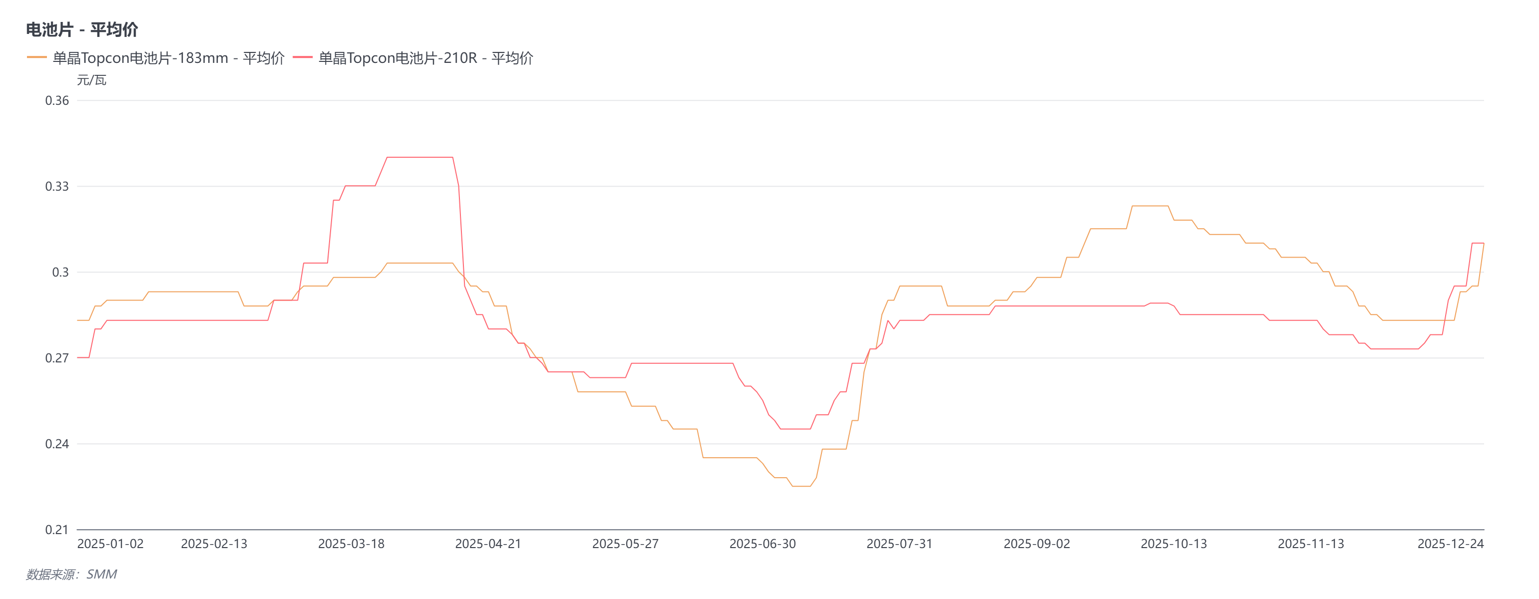 且值得一提的是,近期,随着银价持续刷新高,电池片成本也随之攀升,自12月17日以来,单晶Topcon电池片-183mm现货报价已经从低点的0.283元/瓦涨至0.31元/瓦,涨幅达9.54%。
