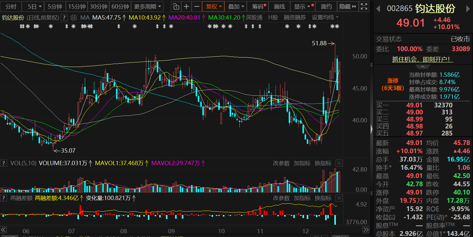 12月24日,在光伏设备板块大涨的背景下,钧达股份午后开盘“逆袭”,成功以10.01%的涨幅报49.01元/股。