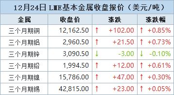 12月24日(周三),伦敦金属交易所(LME)期铜连升第六个交易日,续创历史新高,逼近12,300美元,因美国经济强劲增长提升需求前景,同时美元走弱提供支撑。