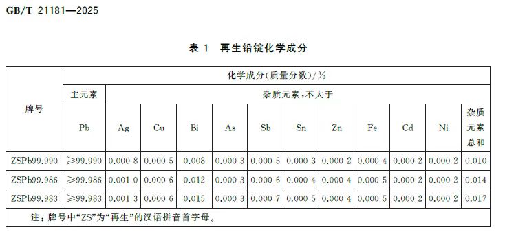 2025年8月29日,国家市场监督管理总局、国家标准化管理委员会联合发布了《再生铅锭(GB/T 21181-2025)》(以下简称“新国标”),并将于2026年3月1日正式实行。