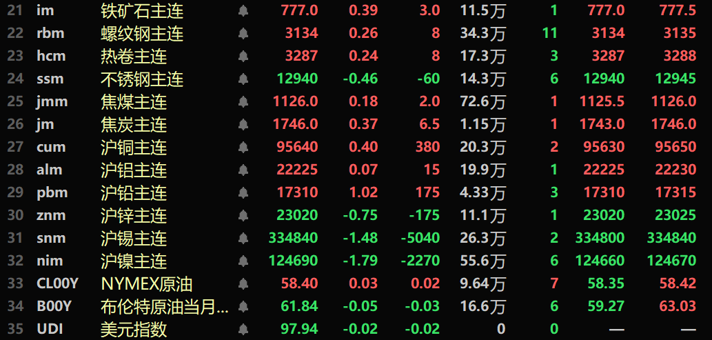 黑色系多飘红,铁矿涨0.39%,螺纹涨0.26%,热卷涨0.24%,不锈钢跌0.46%。双焦方面:焦煤主力合约涨0.18%,焦炭主力合约涨0.37%。