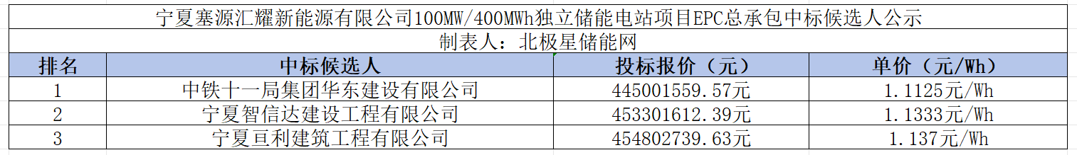 据了解,第一中标候选人为中铁十一局集团华东建设有限公司,投标报价为445001559.57元,折合单价1.1125元/Wh;