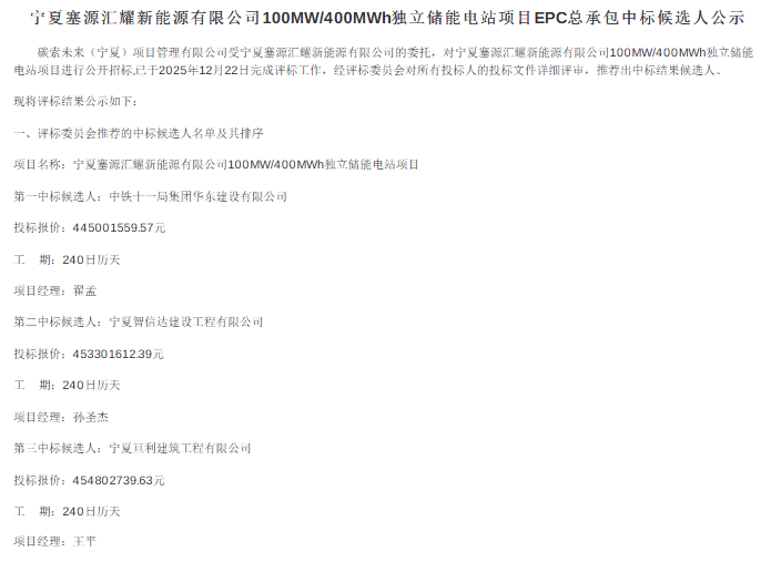 北极星储能网获悉,12月22日,宁夏塞源汇耀新能源有限公司100MW/400MWh独立储能电站项目EPC总承包中标候选人公示。