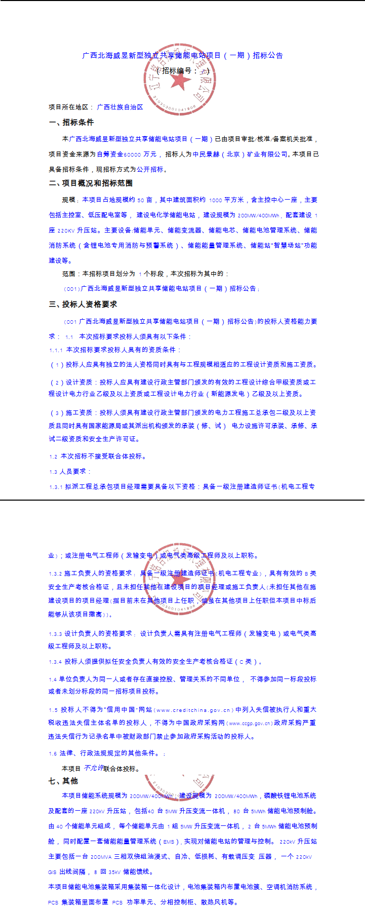 12月23日,广西北海威星新型独立共享储能电站项目(一期)招标公告发布,该项目由中民景赫(北京)矿业有限公司担任招标人,项目资金来源为自筹资金60000万元,本次招标采用公开招标方式,且不接受联合体投标。